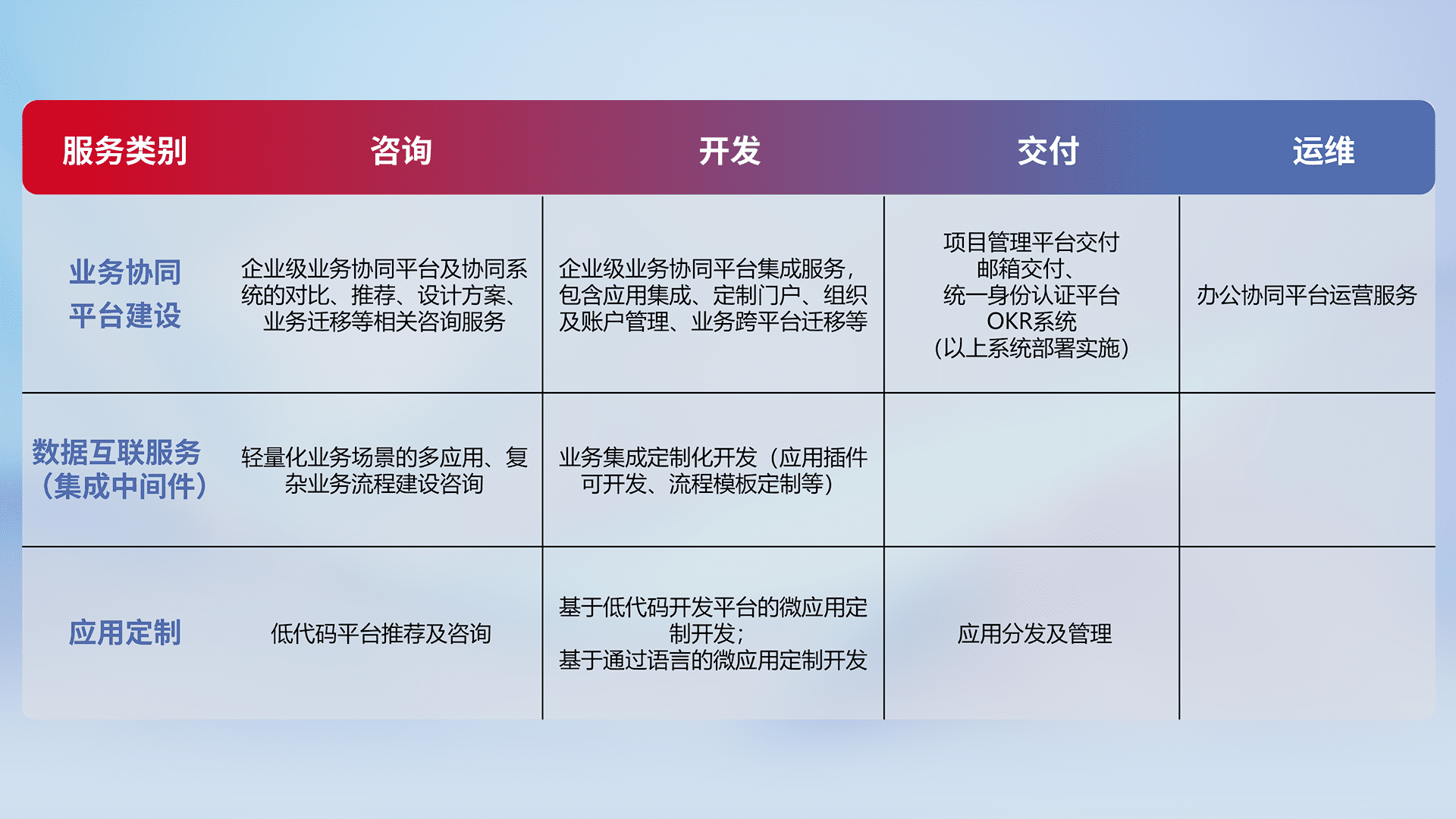 针对钉钉、、、企微、、、IDaas等平台级产品提供产品的规划、、方案、、交付、、、定制化开发等服务,,,,实现如统一协同办公、、智能客户服务、、混合会议管理、、智能数据查询、、、等业务场景,,,实现数字化转型。。。